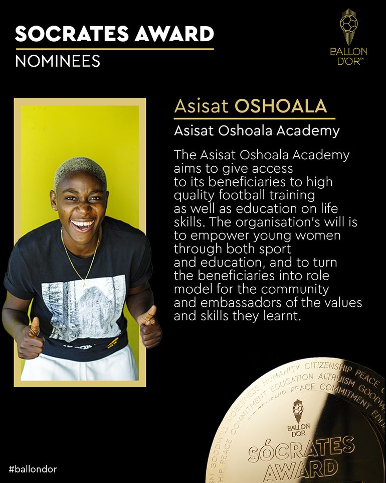 According to the organisers, France Football, Super Falcons’ Oshoala has been recognised for her football academy, the Asisat Oshoala Academy.