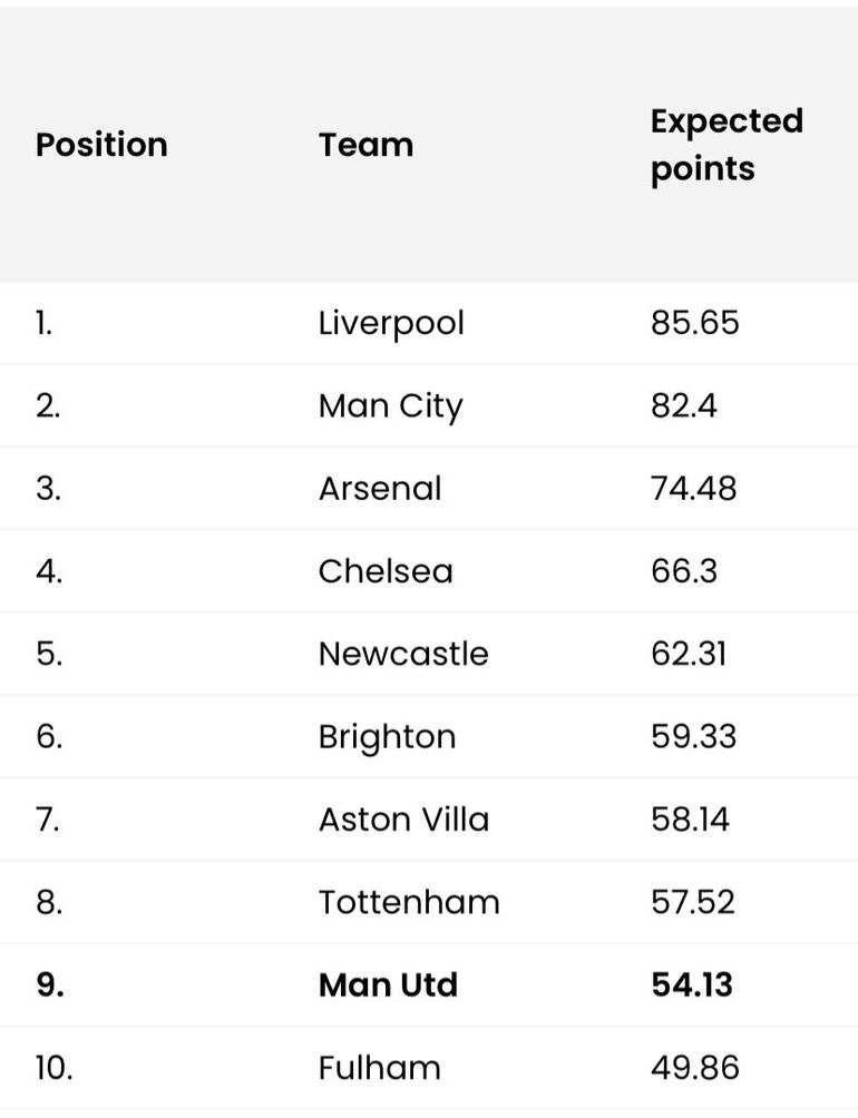 According to their stats, United will finish ninth in the Premier League with 54.13 points - their worst performance ever!