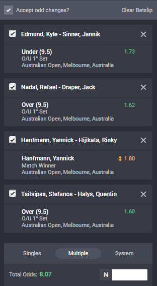 Sure 8 odds accumulator on Bet9ja for Australian Open ATP