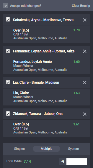 We have made available an accumulator of 7-odds from the Australian Open WTA and hope for a green week.