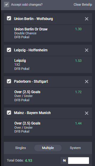 We have made available an accumulator of 4-odds from DFB Pokal and hope for a green week.