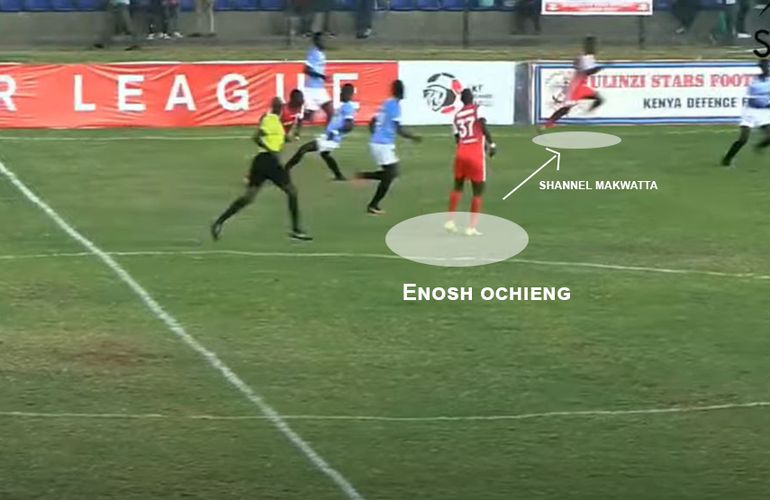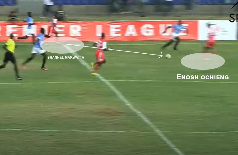Boniface Muchiri receives possession before outpacing Shabana left back Brian Magare (who was also at fault for the first goal after he failed to mark Bikokwa properly) before he whips the ball in to Enosh Ochieng who thunders a header into the back of the net.