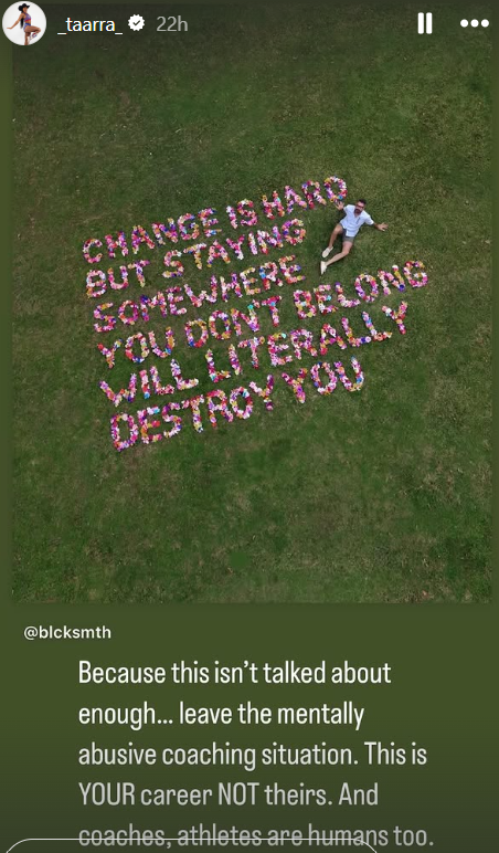 “Change is hard but staying somewhere you don’t belong will literally destroy you,” the post reads, adding: “Because this isn’t talked about enough. Leave the mentally abusive coaching situation. This is your career not theirs and coaches, athletes are humans too.”