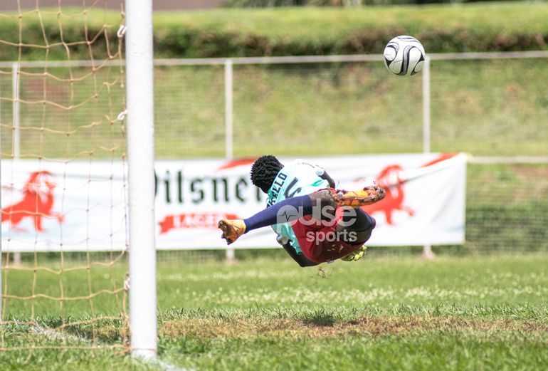 Onduparaka goalkeeper Mathias Okello pulls off a save against Express FC in the StarTimes Uganda Premier Leauge game at the Mutessa II Stadium in Wankulukuku | Pulse Sports Image
