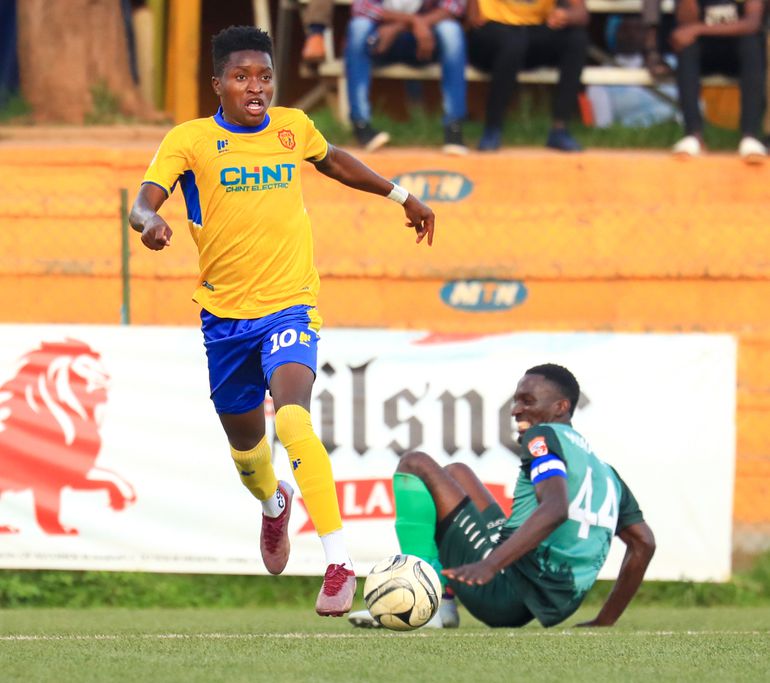 KCCA FC's Allan Okello leaves UPDF's Bernard Muwanga on the ground as the two sides played to a one-all draw at the MTN Omondi Stadium in Lugogo on Easter Sunday | KCCA FC Image