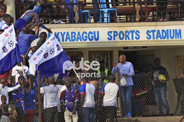 SC Villa President Haji Omar Mandela (blue shirt) shares a light moment with the Joggo faithful after their 3-1 win over Wakiso Giants at the StarTimes Premier League tie played at the Kabaka Kyabaggu Stadium in Wakiso | Pulse Sports Image