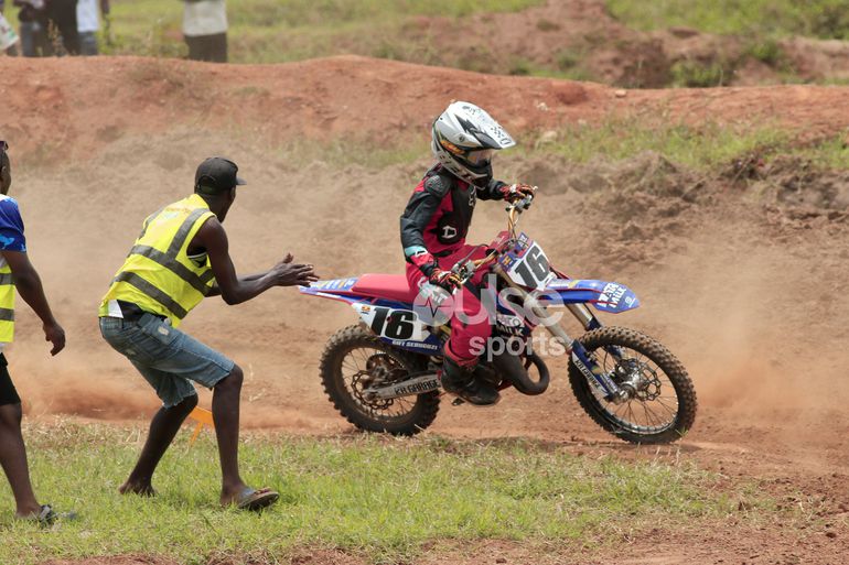 A safety Marshall seems to encourage Gift Ssebuguzi during the FIM Africa Central Motocross MX Championship in Busika on Easter | Pulse Sports Image