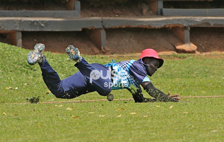 Fred Achelam of ACC trying to support a boundary against Aziz Damani in the National T20 League at the Lugogo Cricket Oval | Pulse Sports Image