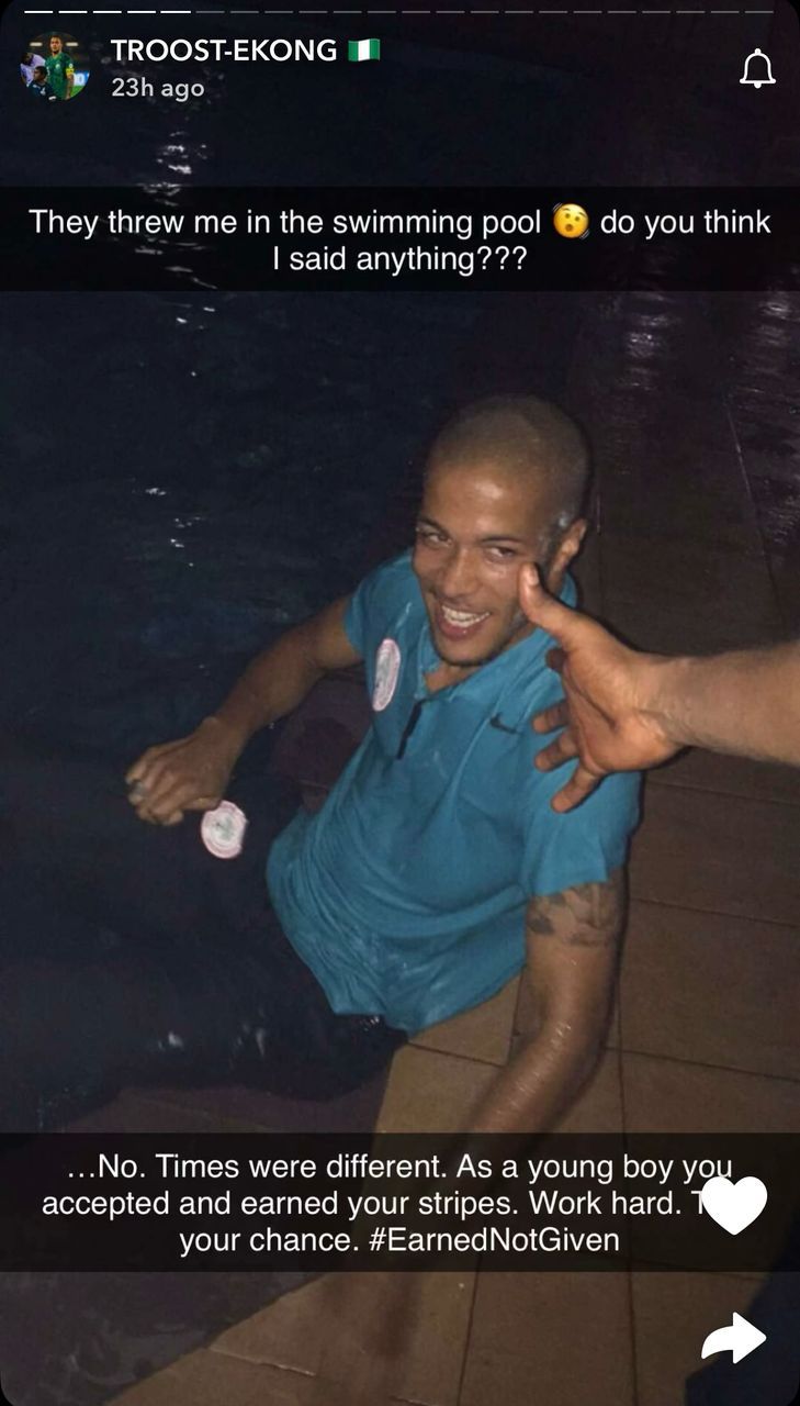 "They threw me in the swimming pool. I said anything???...No. Times were different. As a young boy you accepted and earned your stripes. Work hard. Your chance. #EarnedNotGiven," Ekong wrote in a now-deleted post.