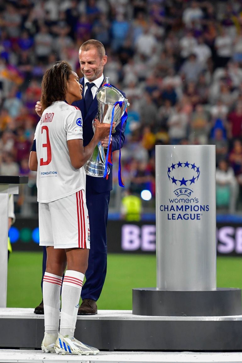 Lyon captain Wendie Renard receiving the UWCL trophy from UEFA President Aleksander Ceferin | Imago