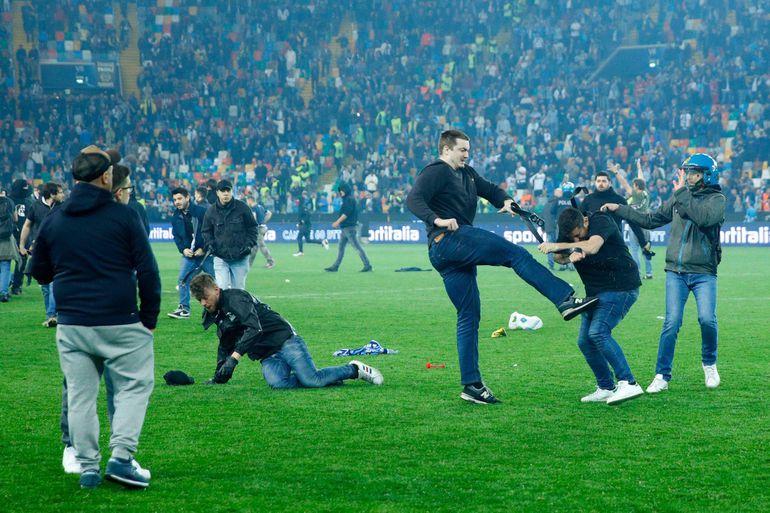 Daily Mail reports that scores of fans raced onto the pitch at the Friuli stadium after the final whistle blew and used their belts to beat each other in violent scenes.