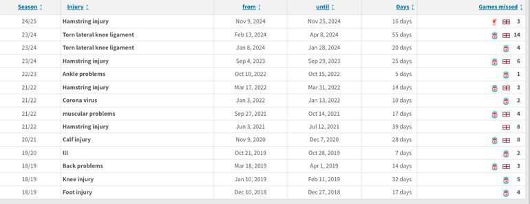 Trent Alexander-Arnold's injury history (Credit: Transfermarkt)