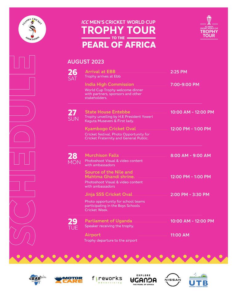 The local cricket governing body confirmed the trophy tour itinerary, including a visit to the state house with the President H.E Yoweri Kaguta Museveni and the Parliament of Uganda.
