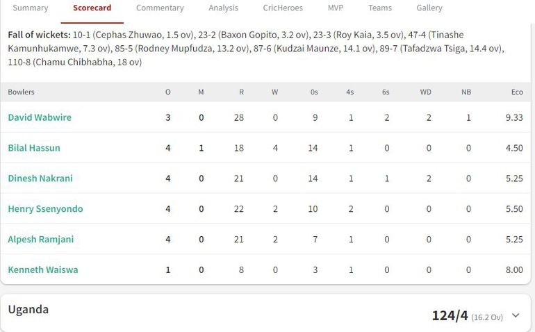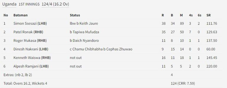 In response, Uganda's batting lineup showed strength and coordination, achieving 124 runs for the loss of only 4 wickets.