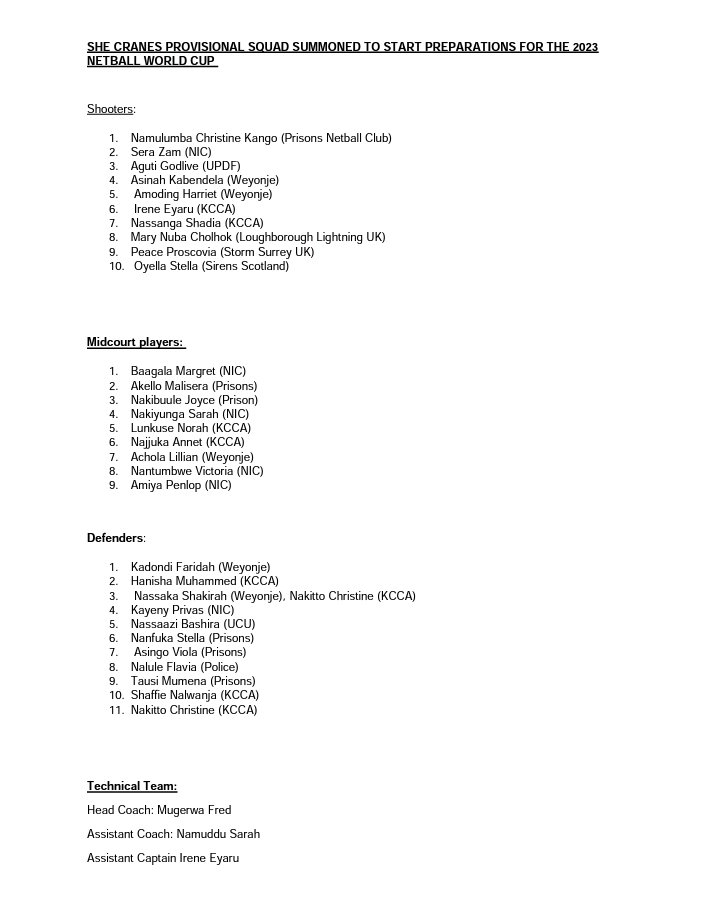 Locally, KCCA, Weyonje and Prisons Netball Club stars dominated the list as NIC, UPDF, UCU, and Police also contributed the other numbers.