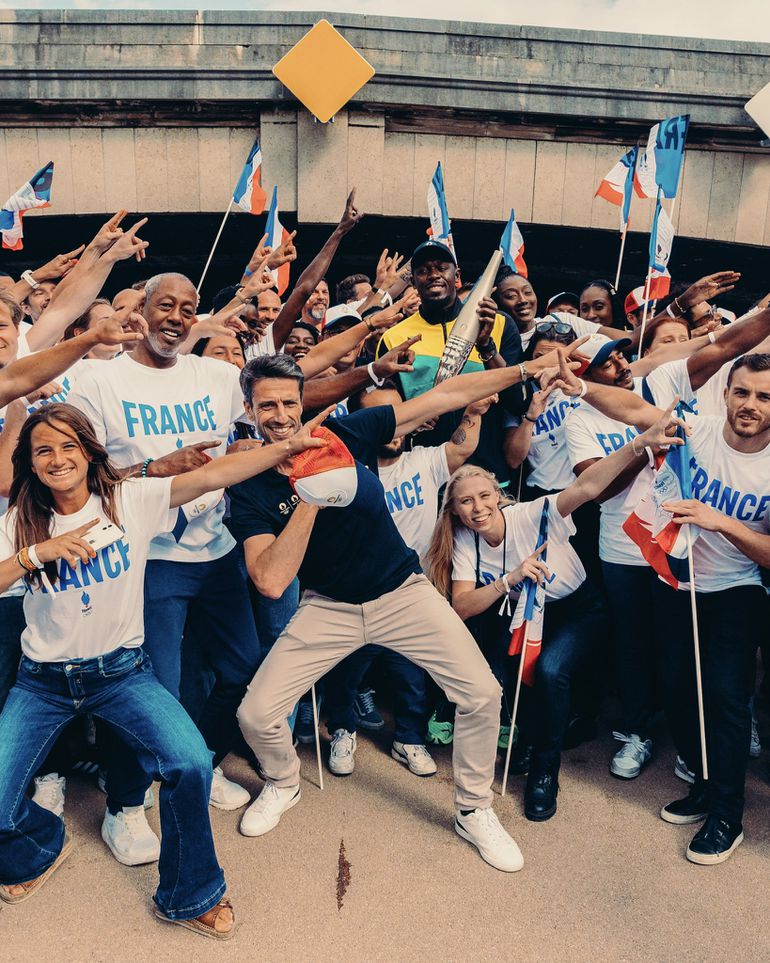 The Olympic legend was in Paris to celebrate with French athletes and fans as they took pictures to mark the memorable occasion.