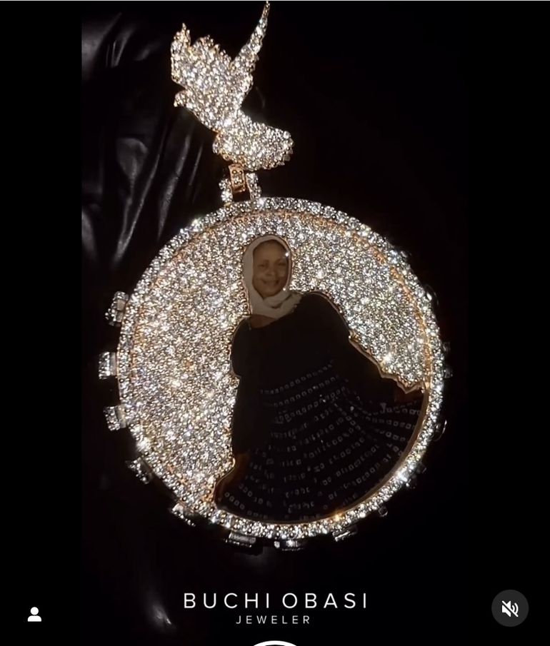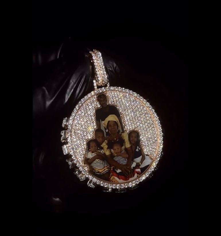 One of the large pendants features an encrusted Diamond inscription that reads “Dreams Are For Real” with a throwback picture of his late mother and his siblings.