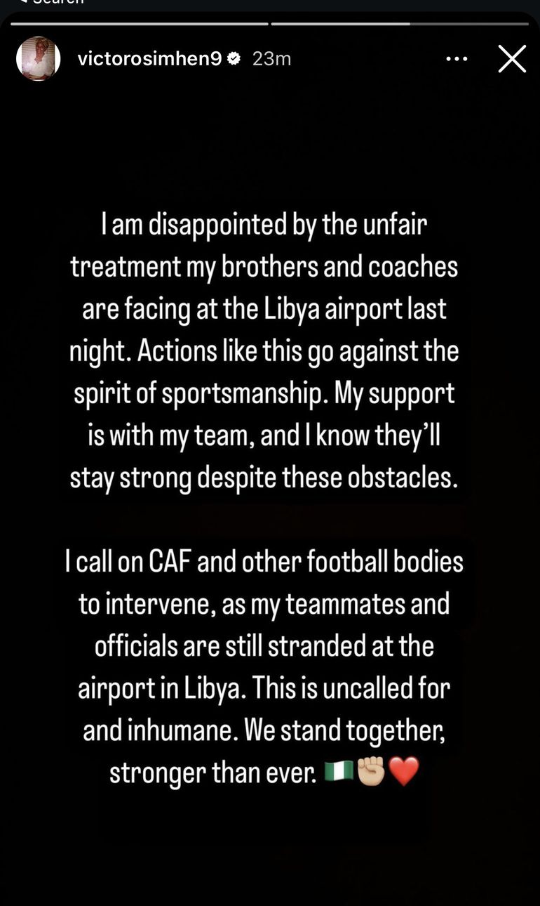 "I call on CAF and other football bodies to intervene, as my teammates and officials are still stranded at the airport in Libya. This is uncalled for and inhumane. We stand together, stronger than ever
