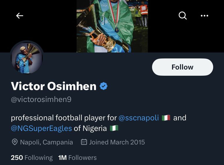 As the most influential Nigerian footballer on the platform, Osimhen now follows in the footsteps of former Super Eagles star Victor Moses, who is the only other Nigerian footballer on the X platform with at least a million followers.