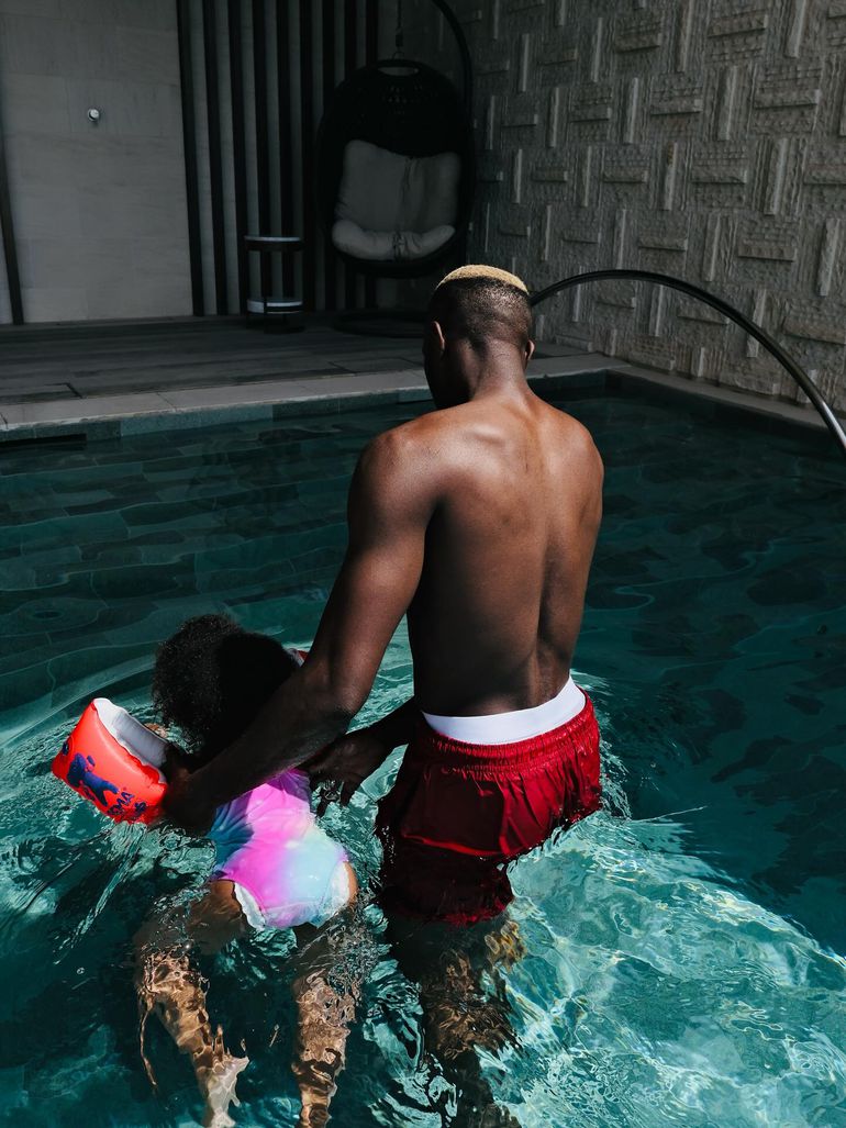 Osimhen in the picture is shirtless supporting his daughter as she learns to navigate the water.