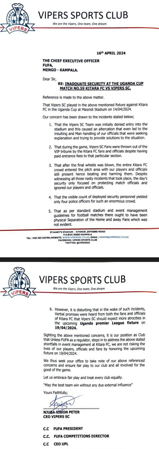 "Sighting the above mentioned concerns, it is our position as Club that Unless FUFA as a requlator, steps in to address the above stated shortfalls in event management at Kitara FC, we are not risking the lives of our players, officials and fans by honoring the upcoming fixture on 19/04/2024."