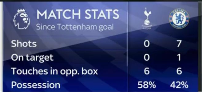 It was remarkable that Pochettino’s men got distracted by the chaotic second half of the opening 45 minutes. Statistics provided by Sky Sports showed the Blues had settled and were starting to make inroads into the Tottenham attacking third after the home side’s early goal, outdoing their hosts for shots — 7-0 — and matching them for touches in the penalty area (six).