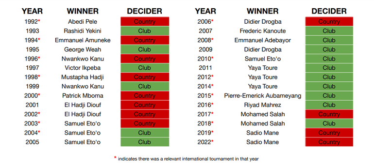 Notice that block of green from 2007 to 2016? In every one of those years, club form was the major deciding factor for the award, irrespective of international tournaments. Note that this span of time took in two World Cups, two Olympic Games (one in which an African nation reached the final), and four AFCONs. This is important because there is a clear trend: there were way more country-influenced awardees for the first 14 (eight) than for the latter 14 (four). As Africa’s footprint at the top of the global game (i.e. European football) has gotten bigger, so has CAF’s willingness to appoint its best players on the basis of club performance increased.