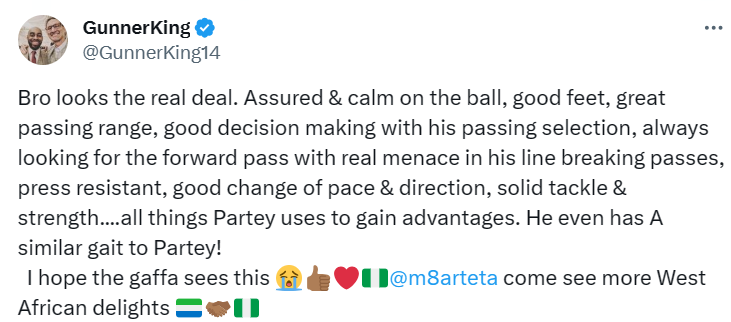 “You guys I was scrolling g through TikTok and I found a Partey profile in the grassroots of Nigerian football,” Santi stated before sharing the video of the youngster. “Never seen anything so obvious,” he added.