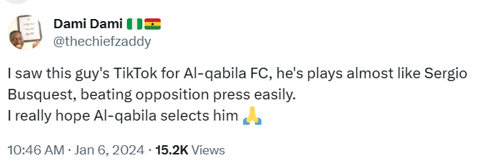 Calls from his compatriots and football lovers followed as they watched highlights where the young defensive, who is in Ogun State and plays for Wesco FA per another post on X.com, displayed his mastery as a holding midfielder.