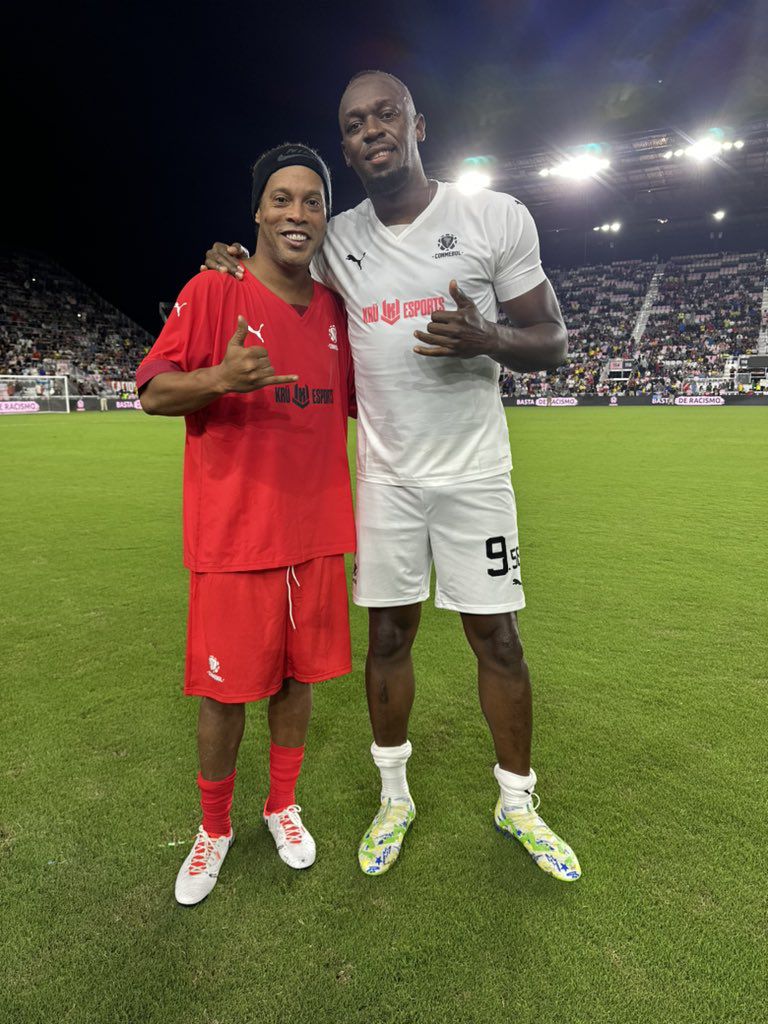 Ronaldinho and Usain Bolt at the CONMEBOL exhibition match in Miami. Photo Credit - @usainbolt / X