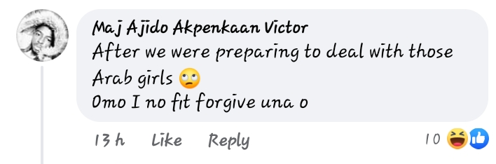 "After we were preparing to deal with those Arab girls 🙄 Omo I no fit forgive una o," MajAjido Victor said.
