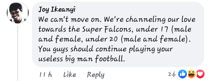 "We can't move on. We're channeling our love towards the Super Falcons, under 17 (male and female, under 20 (male and female). You guys should continue playing your useless big man football," she stated.