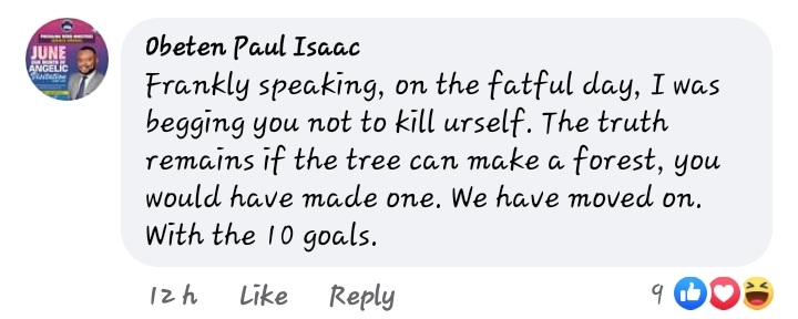 "Frankly speaking, on the fatful day, I was begging you not to kill urself. The truth remains if the tree can make a forest, you would have made one. We have moved on," he said.