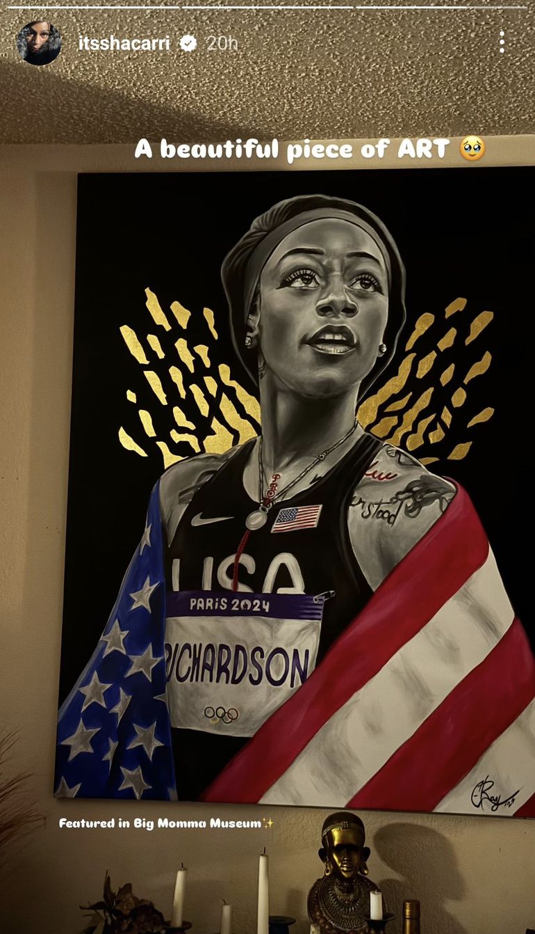 Richardson posted a simple picture of herself in the car and followed it up with a painted Paris Olympics portrait of herself placed in her grandmother's (Big Momma) museum, which she captioned: "A beautiful piece of art."
