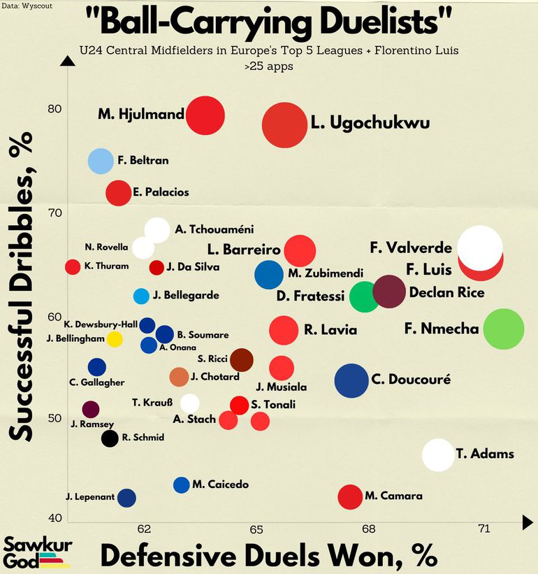 With a dribble completion percentage of 60.0%, Ugochukwu ranks just outside the 80th percentile of midfielders in Europe’s top five leagues, while his defensive and passing stats are just as impressive.
