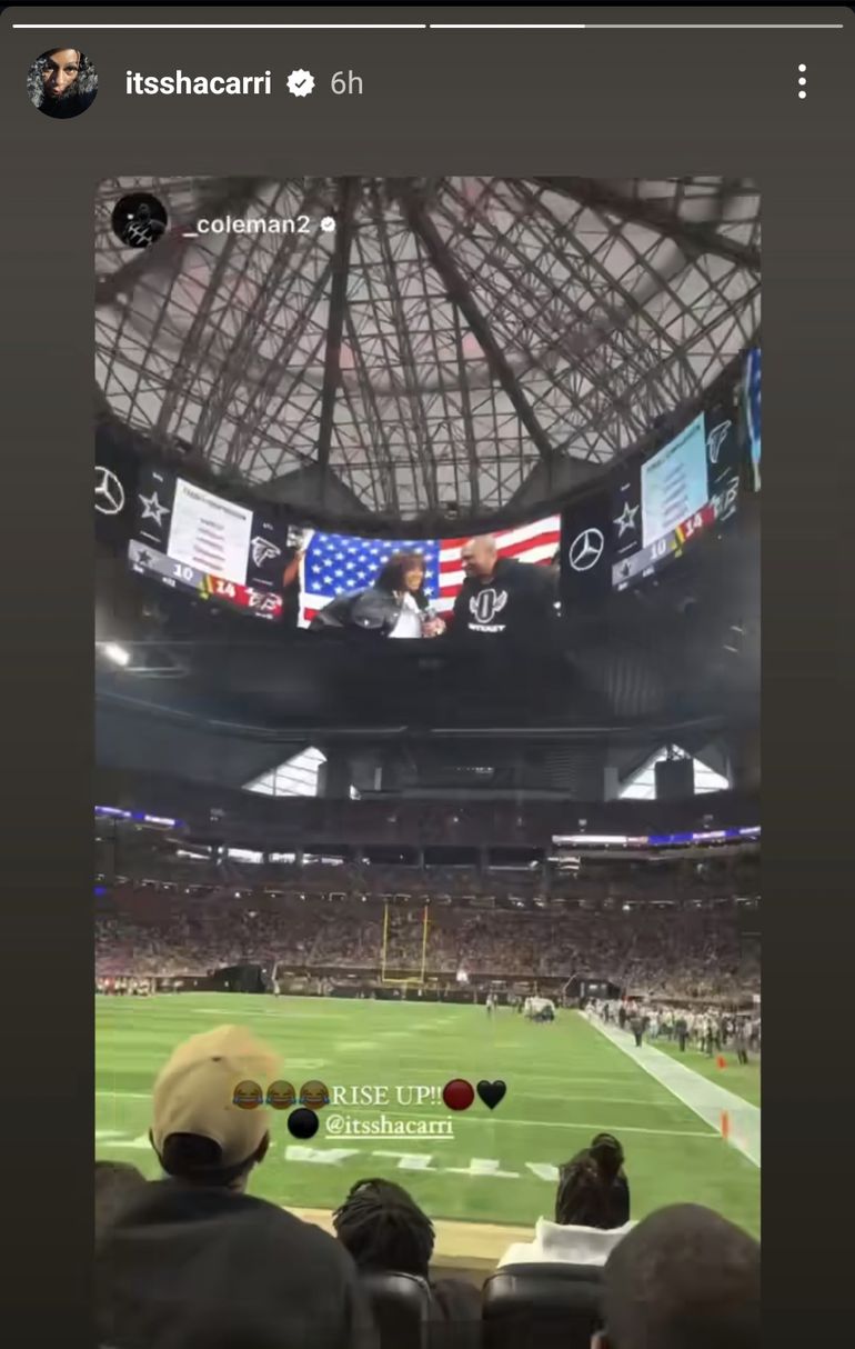 The speedster was shown on the stadium's video board and exclaimed the Falcons' slogan "Rise Up" as the Atlanta crowd gave her a raucous applause which Coleman recorded and posted on his IG story.