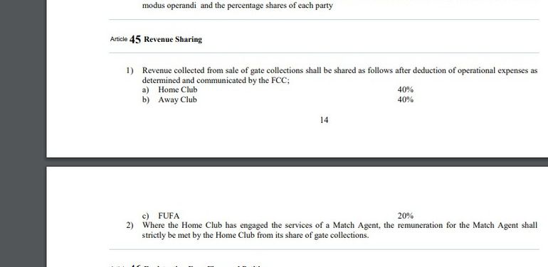“Revenue collected from sale of gate collections shall be shared as follows after deduction of operational expenses as determined and communicated by the FCC (FUFA Competitions Committee); Home Club 40%, Away Club 40%, FUFA 20%”