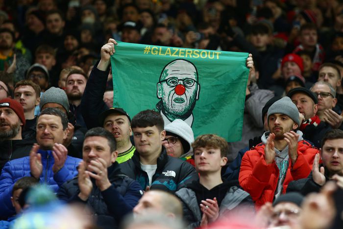 Manchester United fans display Glazers out banner ahead of the game Manchester United v Burnley on December 21, 2022.
