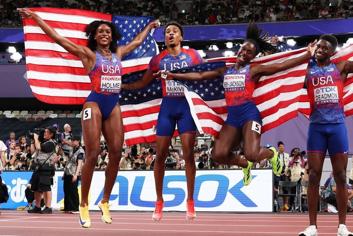 The United States had a team of Bryce Deadmon, Lynna Irby-Jackson, Jenoah McKiver and Alexis Holmes and they fended off the challenge of the Netherlands and Belgium to grab the world title.