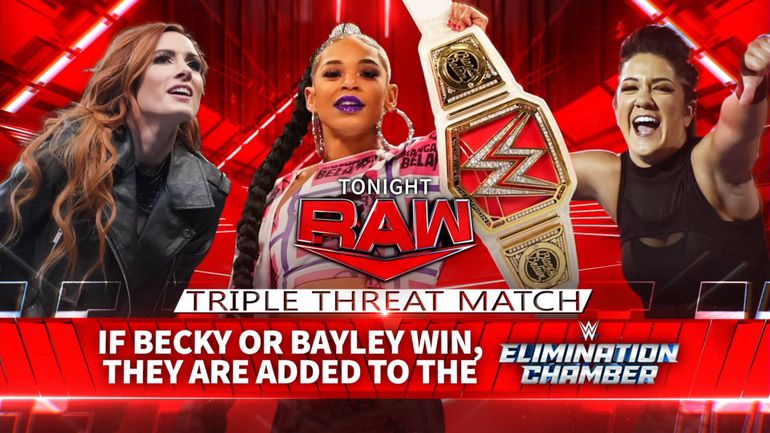 Who will win it all in our #WWERaw main event as @BeckyLynchWWE, @itsBayleyWWE & @BiancaBelairWWE meet in the ring with huge #WWEChamber implications?! pic.twitter.com/KKKHgJhila