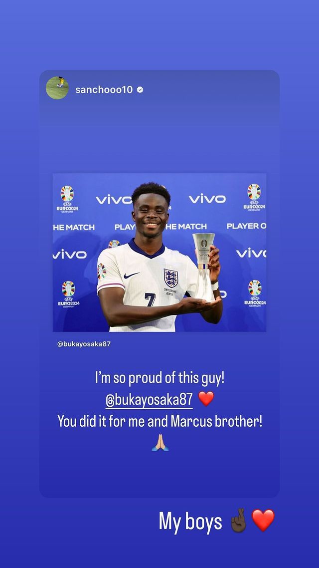 Sancho took to Instagram and wrote, "I'm so proud of this guy @bukayosaka87! You did it for me and Marcus brother!"
