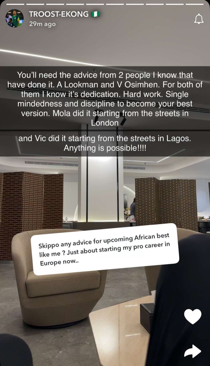 Responding to a question on his Snapchat that read: ‘Skippo any advice for upcoming African best like me? Just about starting my pro career in Europe now..’ the 2023 AFCON MVP did not hold back.