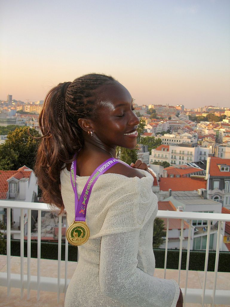 She accessorised with minimalist yellow-gold rings, completing the look with a woven chocolate handbag adorned with her golden WAFCON medal.