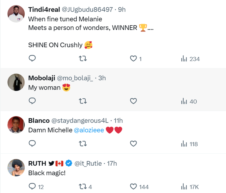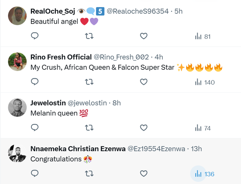 One wrote, “My Crush, African Queen & Falcon Super Star.”